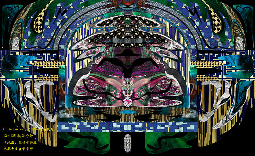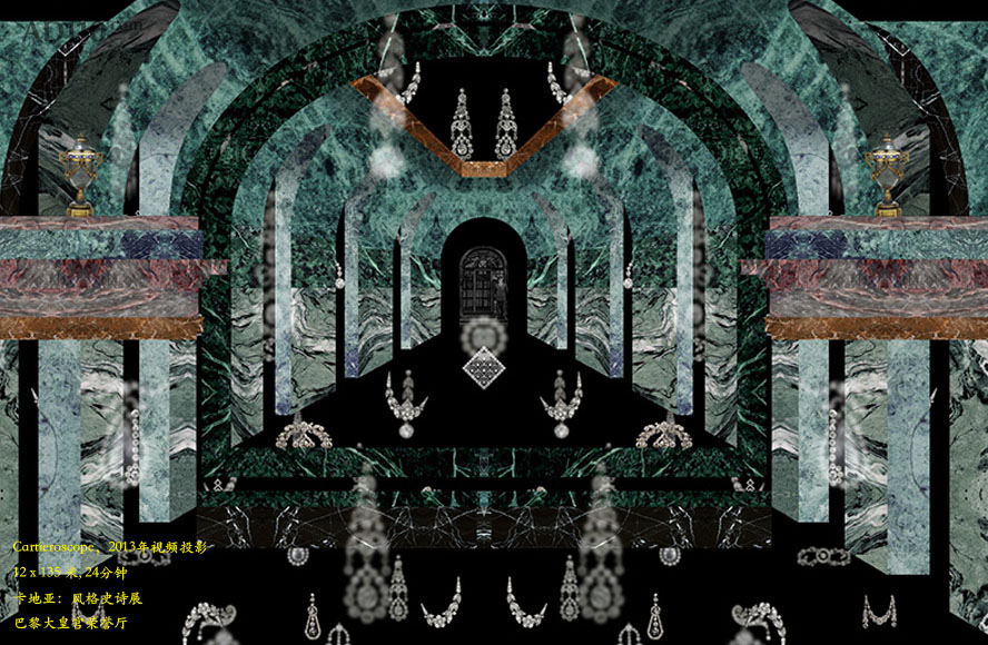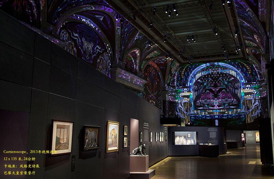 最后一个,也就是“cartieroscope”,这是我们为法国巴黎大皇宫博物馆卡地亚:风格史诗展(cartier. le style & l’histoire,2013年12月4日-2014年2月16日)特别奉上的一份厚礼。当时,我们专门为巴黎大皇宫荣誉厅(Salon d’Honneur)制作了一个长达24分钟,面积为13 x135米的视频投影。当我们第一次造访巴黎大皇宫荣誉厅时,我们几乎瞬间就产生了要将它变成一个巨大的,四周布满镜子的殿堂的念头,这应该源于儿时在巴黎格雷万蜡像馆的一次经历。最后,我想说的是,我们就是痴迷于这种有着鲜活壁画的空间, 我们渴望自由绘制卡特尔珠宝辉煌的历史,为此我们创造了8个场景,将一个令人叹为观止的珠宝世界栩栩如生地呈现在观众面前。
