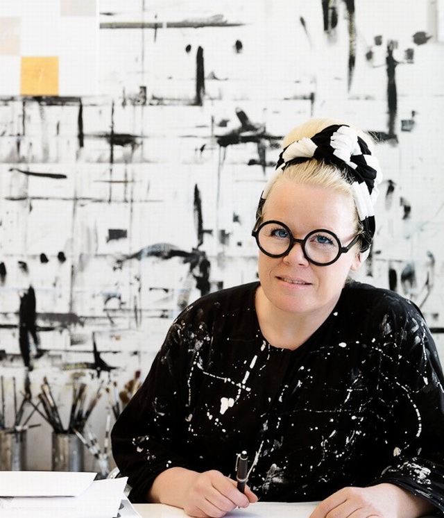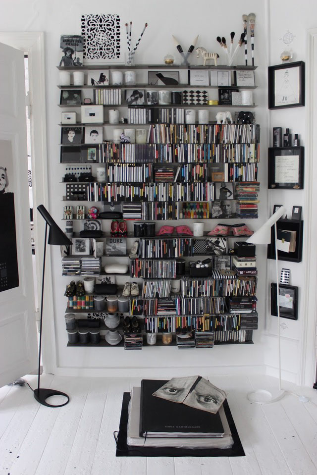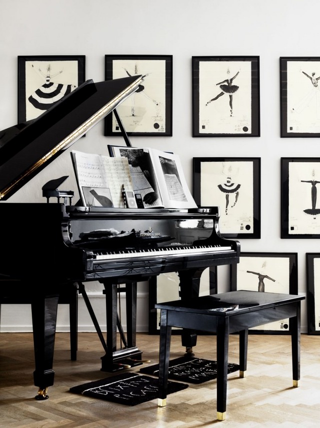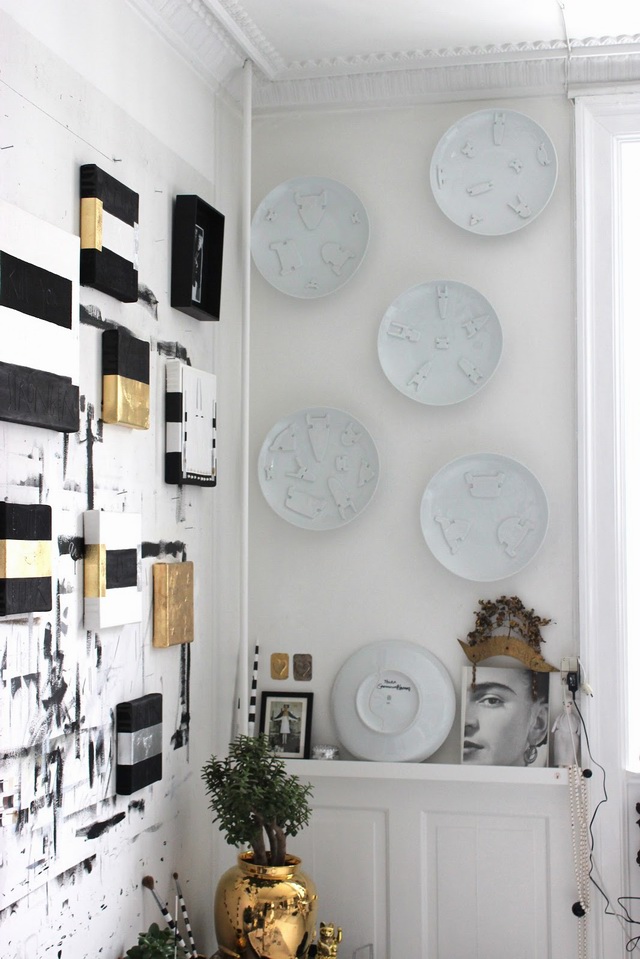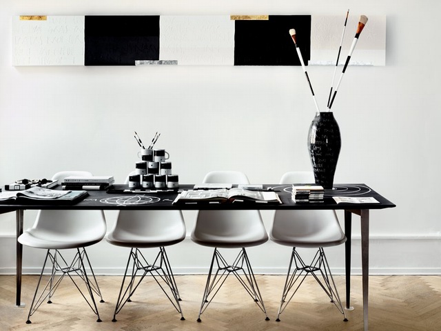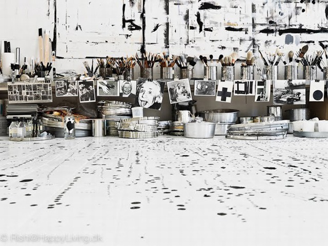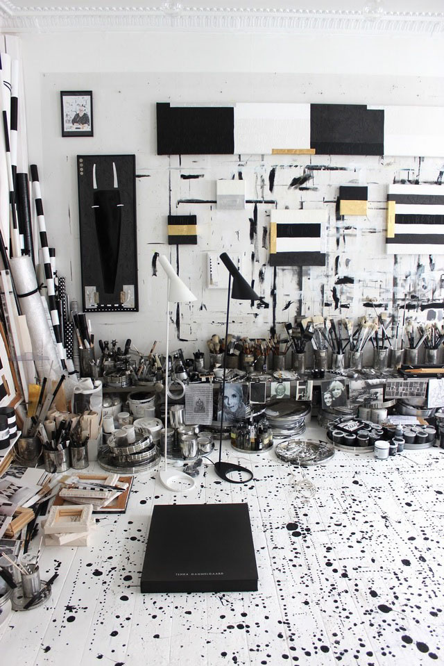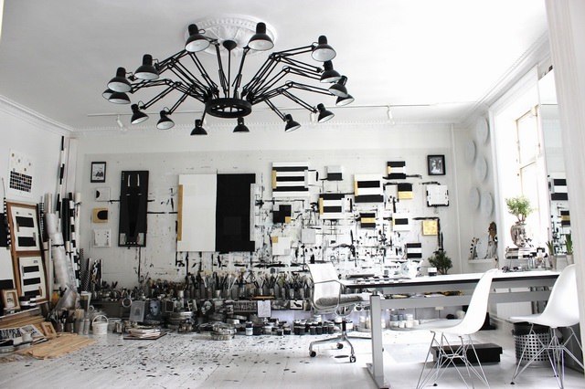 丹麦艺术家Tenka Gammelgaard 运用经典的黑, 白两色作为她工作室的主色调, 又是线条又是黑点, 一眼望去清一色的黑与白具有北欧的极简和乾脆, 不说还以为是黑白照片! 纯白色的地面, 黑色的灯具, 牆上挂满她的黑白画作。