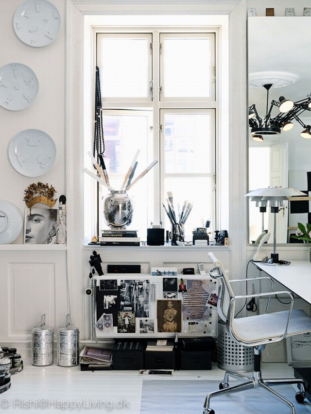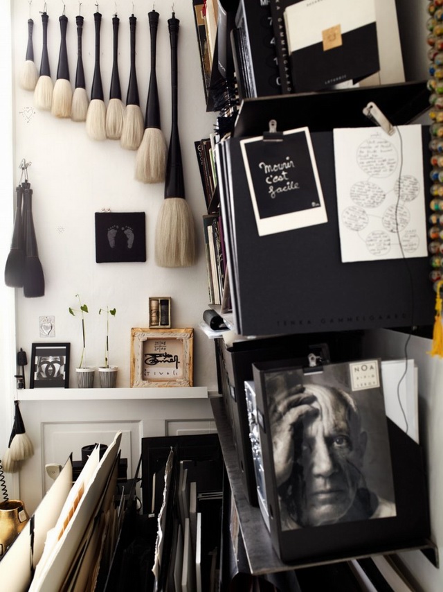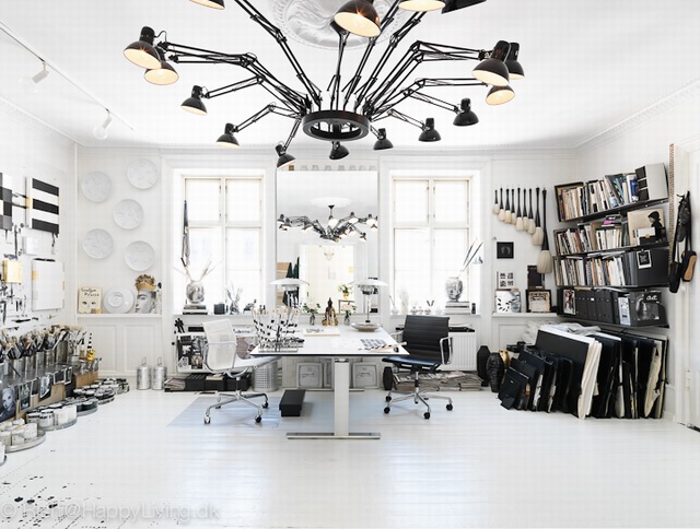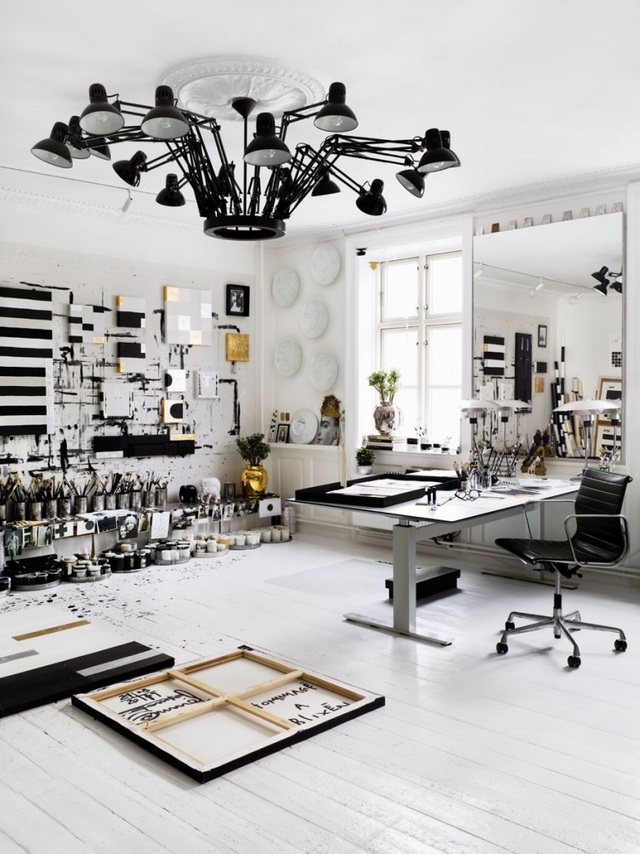创作区的地板因作画而随兴滴下的黑墨点反而成了别具特色的装饰, 还有被当作黑板用粉笔写著字的黑色大书桌, 就连Tenka Gammelgaard 使用的刷具也都被她拿来涂上黑白色的颜料。房间中间最抢眼的八爪鱼一样的黑色吊灯成为这里最张扬不羁的装饰物。