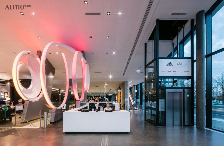 悬挑的结构和楔形切口的设想来源于国王墙大道的城市背景和由柏林德立策划的展览空间。建筑的外形主要受到三个元素的影响: 自由悬浮的建筑主体, 连续开阔的公共空间和底座。 后者是最主要的元素, 尤其是结合周边的环境, 展示欢迎的姿态。建筑的外立面清晰地告诉人们,这里是德国人最热衷的足球运动主题圣地。立面上不规则的铝板穿孔展示出足球的纹理,并设有LED照明。 一副传统足球的图形, 透过方形的空洞展现出来,两层立面之间的画副可根据需要随意更换。正立面的扁长型LED屏幕,完善了这座体验式建筑的外型。