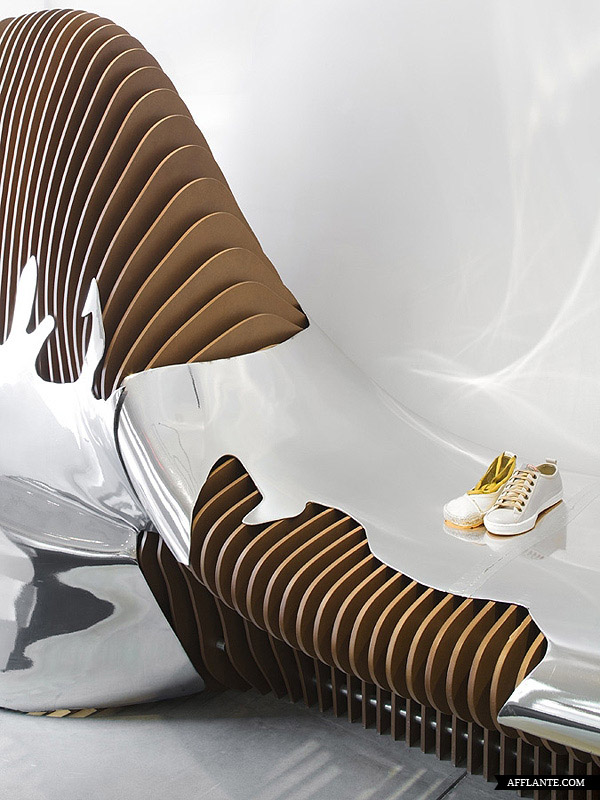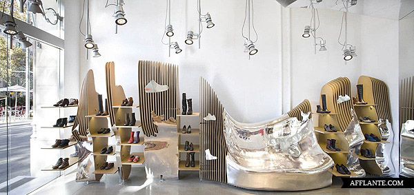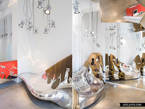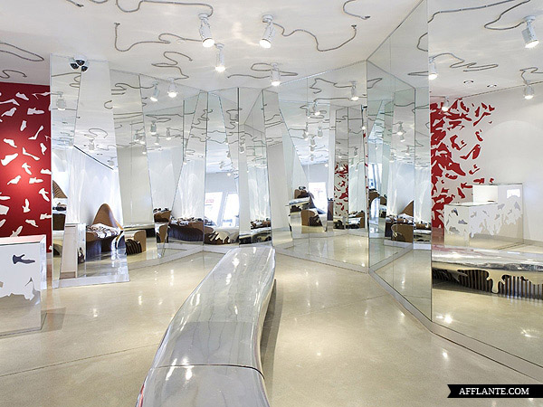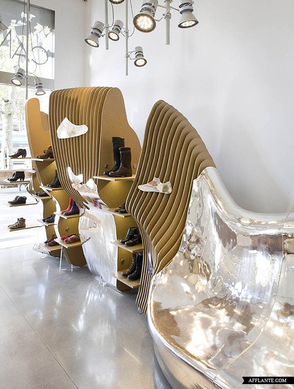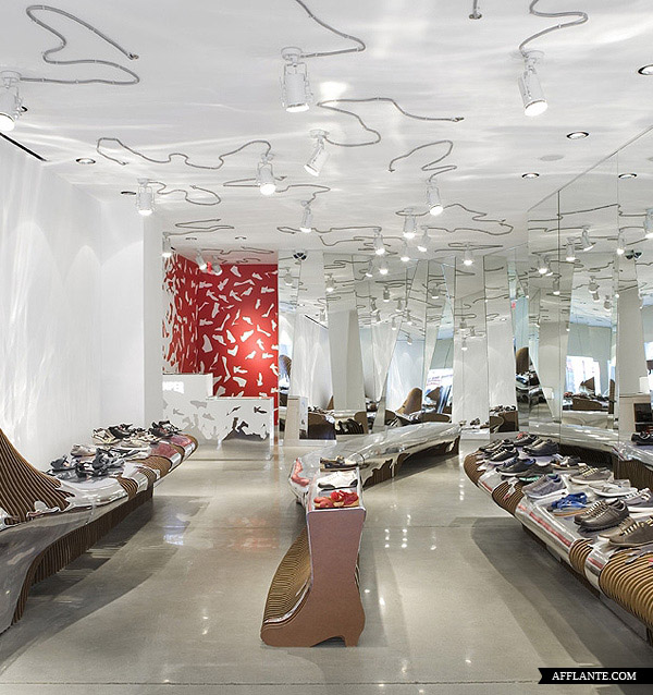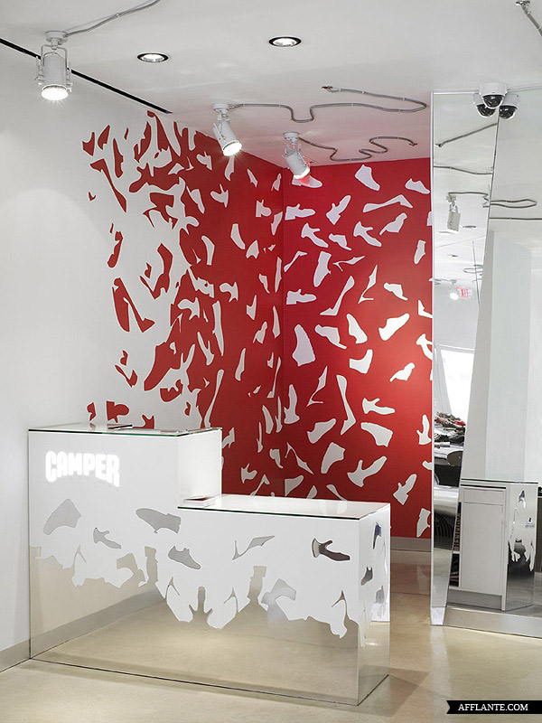 Camper Shoe 每开一家新店均邀请不同的设计师或艺术家为其进行惊世骇俗的创作,去年底他们在华盛顿开设一家专卖店,邀请到西班牙建筑师 Benedetta Tagliabue 进行全新的创作。Benedetta Tagliabue 采用超有感觉的镜面设计,搭配独特的照明,使整个店内达到前所未有的颠覆。
